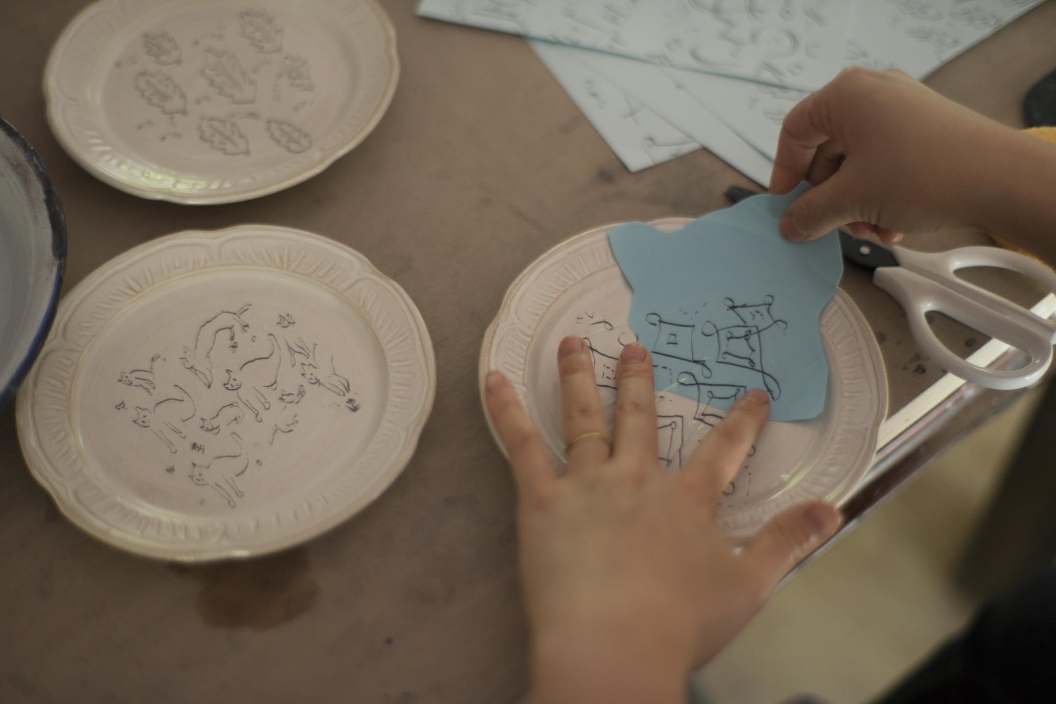 また、「ピクニック」がテーマの時には、食器にシールをコラージュして「転写」するという技法を取り入れ、ピクニックセットをつくった。「転写」という技法は工業製品(大抵が磁器)に用いられるもので、陶器に使用する作家はまずいないという。