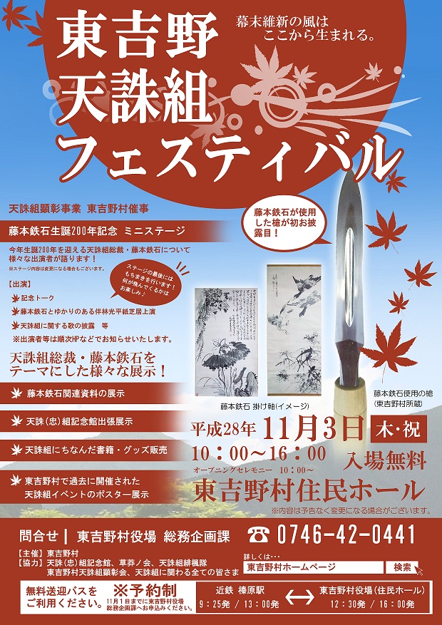 協力:天誅(忠)組記念館、草莽ノ会、下市町文化連盟、「維新の魁・天誅組」保存伝承・顕彰推進協議会、受福寺、如意輪寺、らくうぇる、岡山縣護国神社、天誅組緋楓隊、東吉野村天誅組顕彰会、天誅組に関わる全てのみなさま